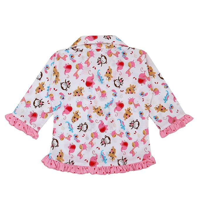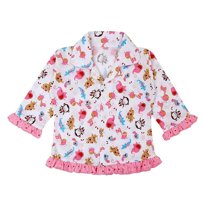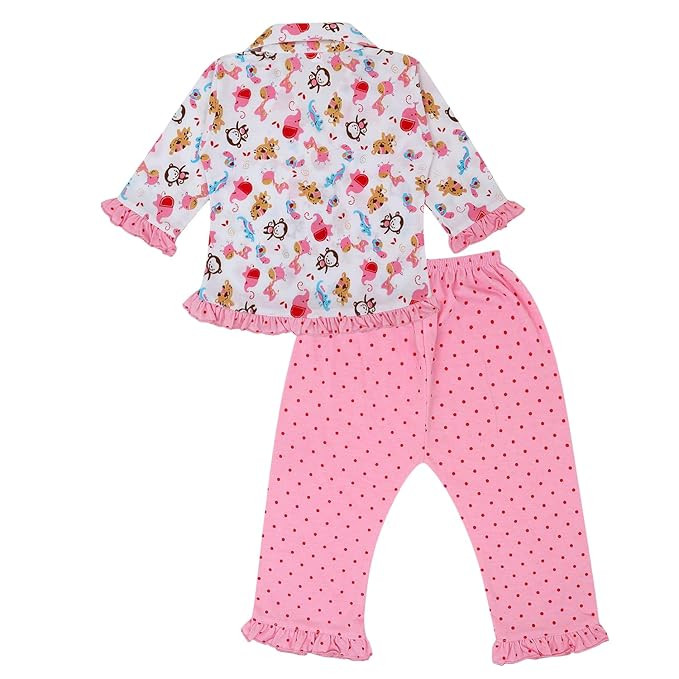 Soft, Comfortable & Skin Friendly, Features - Top: White With Printed, Full Sleeves, Collared With Front Buttons And Frill Design, Lower: Easy Elastic, Colourful Print, Straight Fit, Frill At The Bottom Ideal For Baby Girl and Sleepwear, Extremely Comfortable For All Night Sleep Size Guide: In general, Please Buy a size larger if you are uncertain about the size, as most people prefer loose-fitting sleepwear Wash Guide: Normal Machine Wash