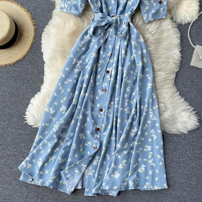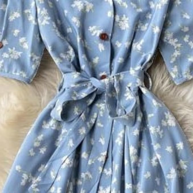 Stylish half-sleeve dress with front button and tie-up belt Elegant V-neck and puff sleeves for a feminine look All-over floral print in vibrant colors Made from high-quality, breathable fabric erfect for both casual and formal occasions