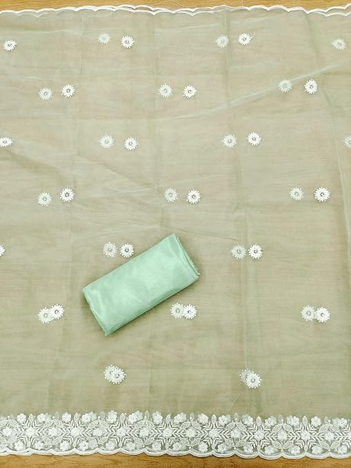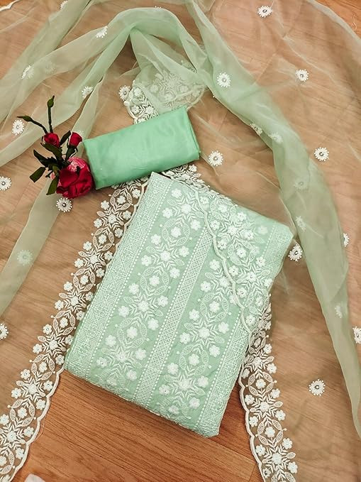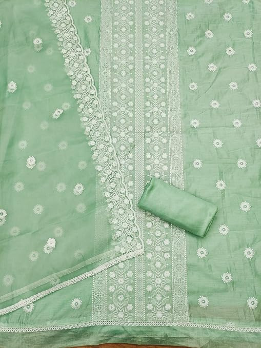 Top Fabric: Pure Modal Chanderi (1.90 meters) Bottom & Inner Fabric: Shantoon (3.80 meters) Dupatta Fabric: Organza (2.10 meters) Work Type: Embroidery Work Size: Free Size up to 42" (Semi Stitched)