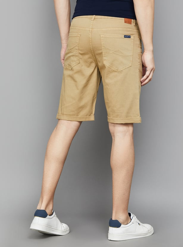 Step into these stylish 5-pocket shorts and let your fashion sense shine. Made from stretch solid denim, they offer a mid-waist that fits perfectly and a zip fly that glides effortlessly. The slim fit is designed to accentuate your silhouette beautifully.