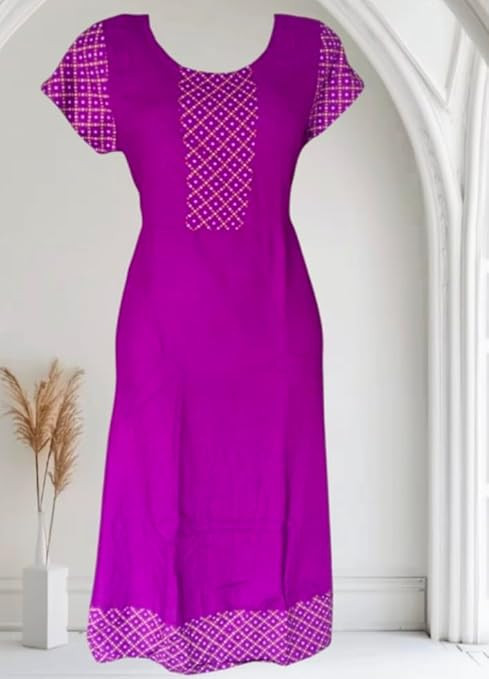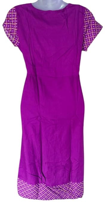 Vibrant Colour: This dress features a striking purple shade that adds a pop of colour to your wardrobe. Intricate Embroidery: The bodice is adorned with intricate embroidery in a crisscross pattern, adding visual interest and texture. Comfortable Cotton: Crafted from breathable cotton fabric, ensuring comfort and ease of movement. Cap Sleeves: Designed with cap sleeves for a feminine and flattering silhouette. Ankle-Length: The dress falls gracefully to an ankle-length, providing coverage while allowing for a breezy feel.
