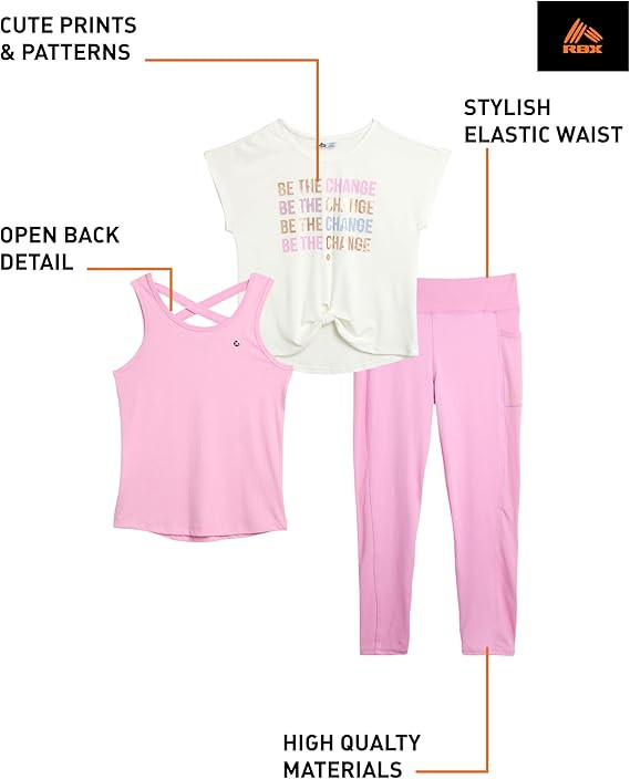 STYLISH ACTIVEWEAR SET: This 3-piece RBX girls' set includes a short sleeve performance tee, a matching tank top, and capri leggings. Each piece is crafted with a focus on comfort and durability, making it perfect for everything from gym class to casual outings. The soft, breathable fabric keeps her cool, while the vibrant colors and playful prints add a fun touch to her active wardrobe.