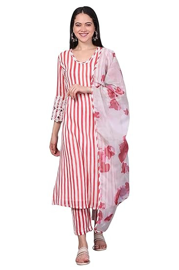 Woman's White and Red Stripes Cotton Crepe Kurta, Straight Pants and Dupatta Set