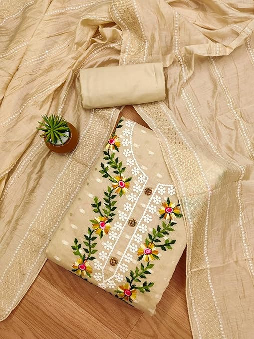 Top Fabric: The dress material features 1.90 meters of Chanderi fabric for the main garment. Bottom & Inner: Included are 3.80 meters of Shantoon fabric for both the bottom and inner layers. Dupatta: A Chanderi dupatta measuring 2.10 meters, matching the top fabric. Work: The ensemble is adorned with intricate embroidery work, adding elegance and detail. An ideal choice for customization, providing the foundation for a stylish outfit
