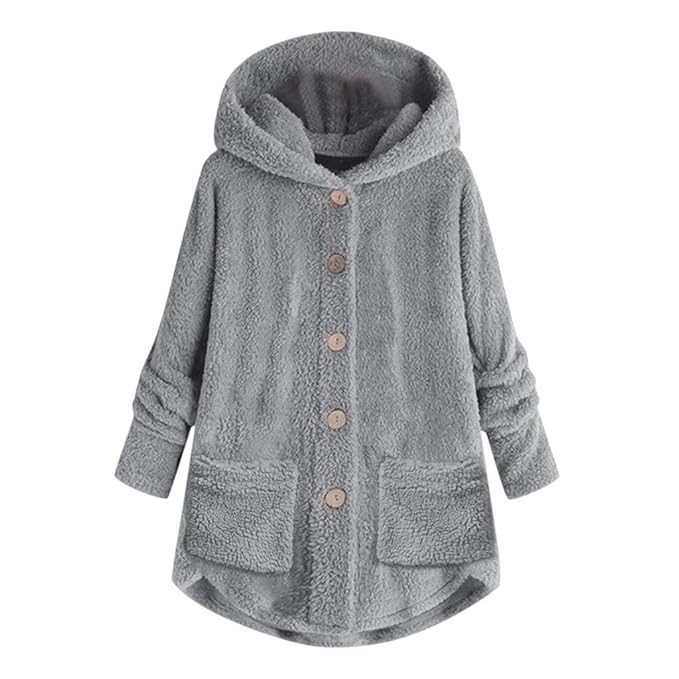 Women's Plus Size Button Plush Hooded Loose Pocket Cardigan Wool Coat Winter Jacket