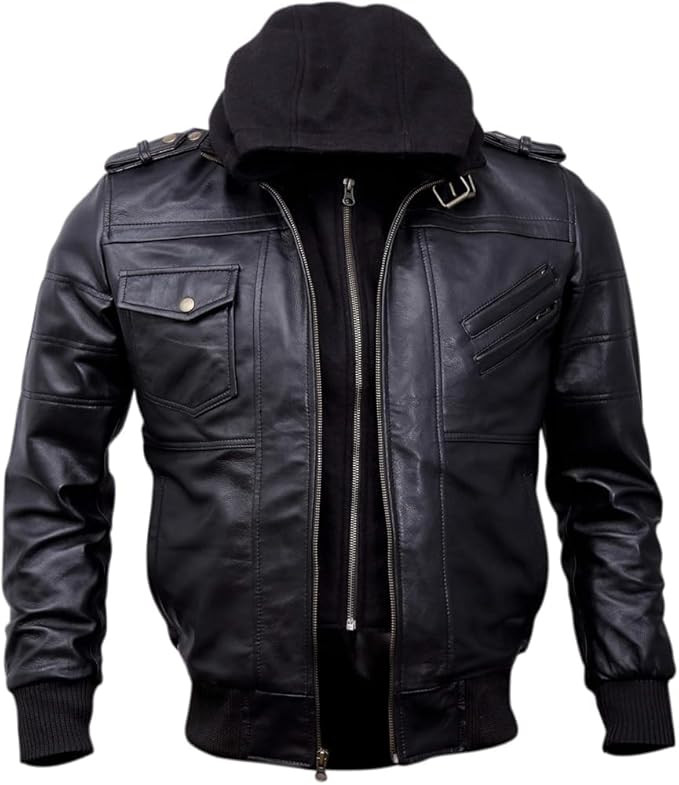 Fabric Men's Black Faux Leather Jacket with Zipper, Multiple Pockets, and Removable Hood Design