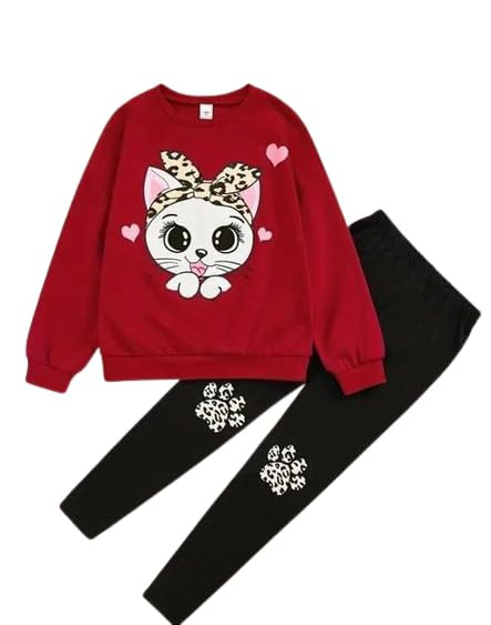 Girl's Cat Print Long Sleeve Sweater Top and Pant Set Pink,Grey,Red