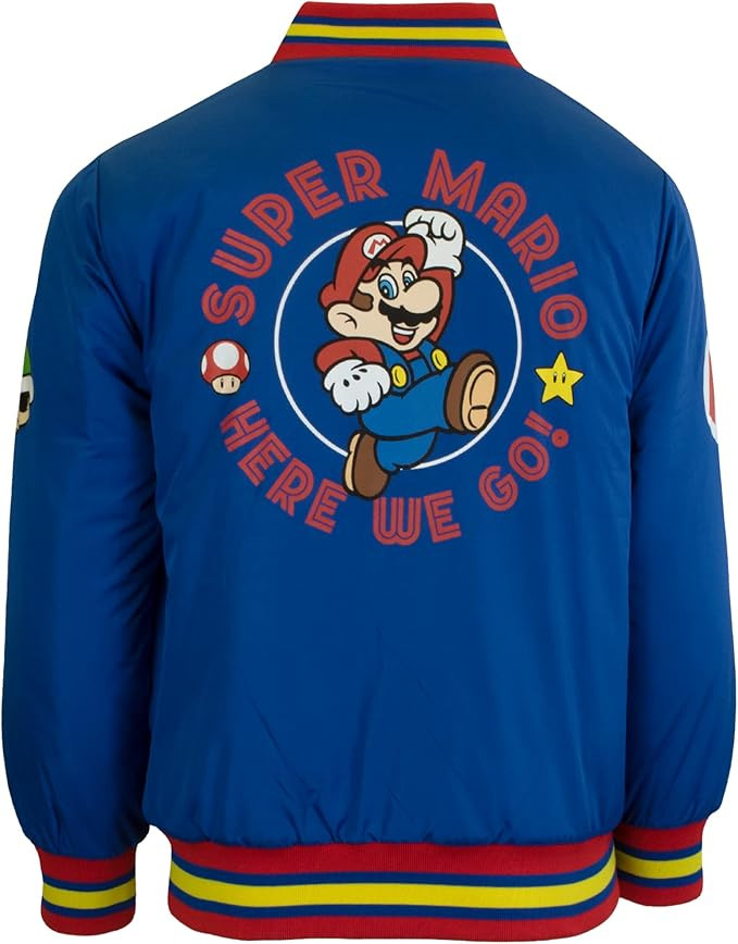 Bomber Jacket for Super Mario Fans: Any child would look great in this cool bomber jacket with the cheerfully portrayed characters and icons from Nintendo Super Mario Bros. video games.