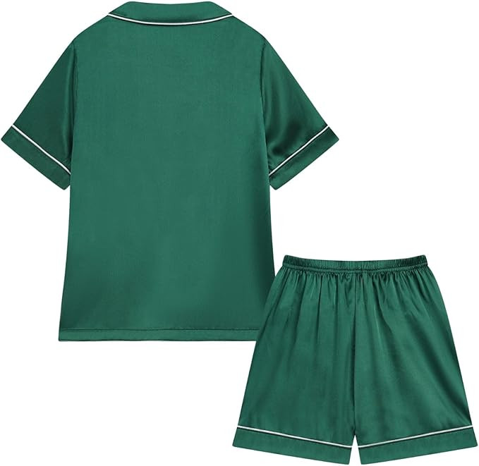 Boys girls pajamas set, soft and silky short sleeve tops, with single-breasted closure, one front pocket, turn-down collar, elastic waistband shorts. Comfortable loungewear set for your kids!