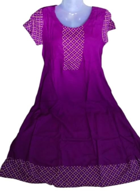 Vibrant Colour: This dress features a striking purple shade that adds a pop of colour to your wardrobe. Intricate Embroidery: The bodice is adorned with intricate embroidery in a crisscross pattern, adding visual interest and texture. Comfortable Cotton: Crafted from breathable cotton fabric, ensuring comfort and ease of movement. Cap Sleeves: Designed with cap sleeves for a feminine and flattering silhouette. Ankle-Length: The dress falls gracefully to an ankle-length, providing coverage while allowing for a breezy feel.
