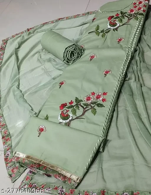 PURE COTTON SUIT WITH FANCY EMBROIDERY WORK ALONG WITH FANCY DIGITAL PRINT LACE ON TOP AND NAJNEEN DUPATTA WITH FOUR SIDE DIGITAL PRINT LACE (TOP+BOTTOM+DUPATTA)