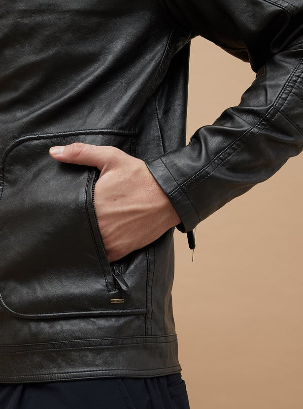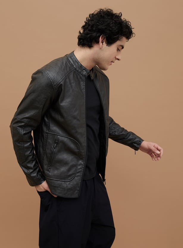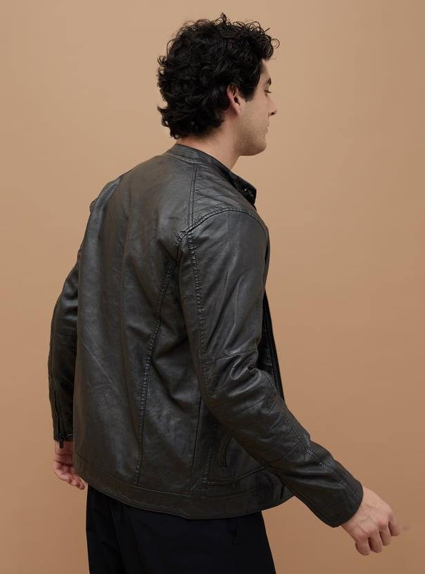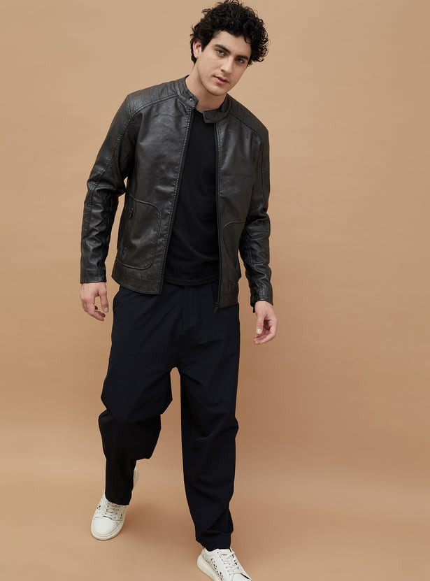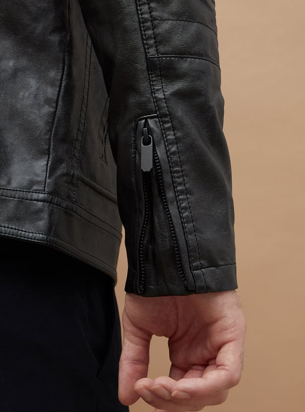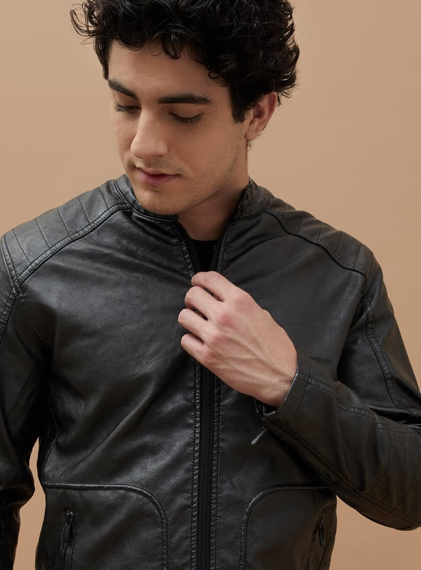 Elevate your style with this sleek solid biker jacket, featuring a mandarin collar with press-button closure, full zip closure, and full sleeves with zipped cuffs. Complete with two zip pockets, it’s the perfect blend of modern edge and functionality.