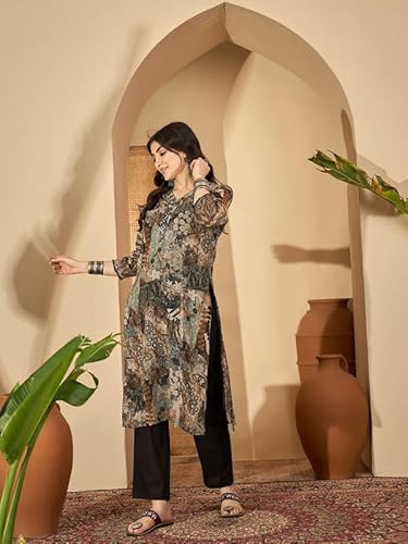 Top Fabric : Organza / Bottom Fabric : Pure Cotton Top Shape : Straight / Color : Grey / Print Pattern : Ethnic Motifs Ornamention : Mirror Work on Neckline / Neck : V-Neck / Sleeves : Three-Quarter Sleeves