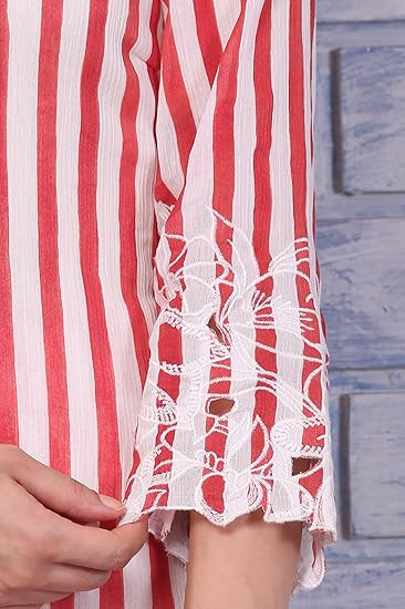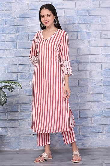 Woman's White and Red Stripes Cotton Crepe Kurta, Straight Pants and Dupatta Set