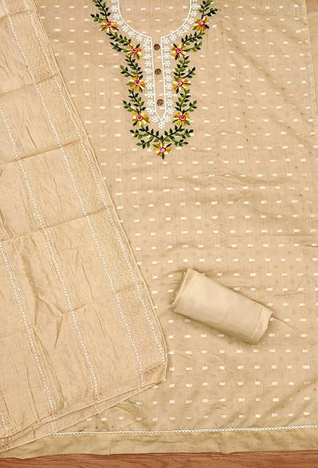 Top Fabric: The dress material features 1.90 meters of Chanderi fabric for the main garment. Bottom & Inner: Included are 3.80 meters of Shantoon fabric for both the bottom and inner layers. Dupatta: A Chanderi dupatta measuring 2.10 meters, matching the top fabric. Work: The ensemble is adorned with intricate embroidery work, adding elegance and detail. An ideal choice for customization, providing the foundation for a stylish outfit