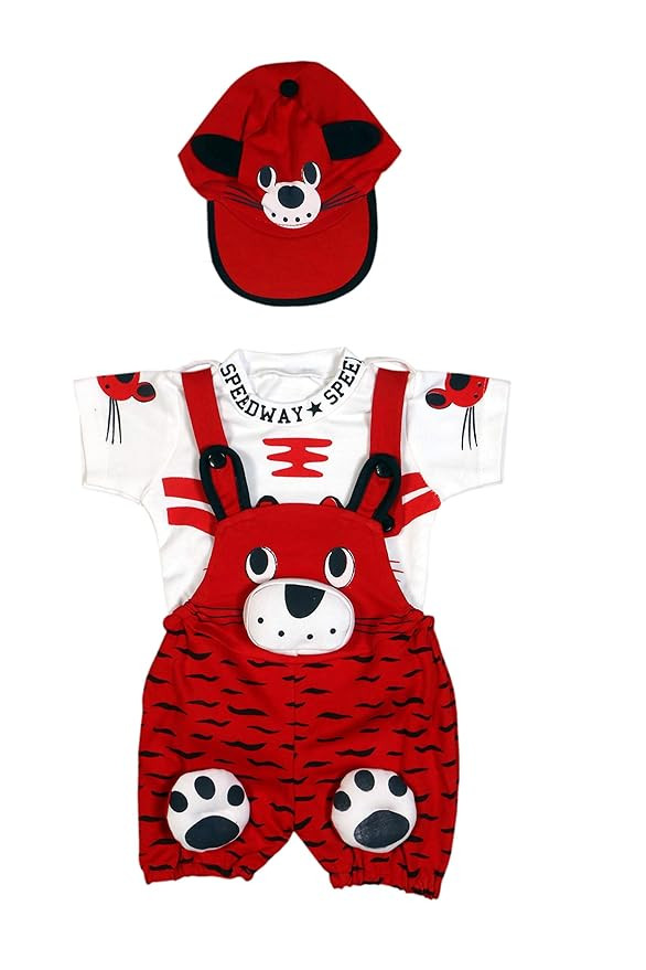 Trendy Dukaan Baby Boy's And Baby Girl's Dungaree Set / Romper Set with T-Shirt (6 Months - 12 Months, Red)