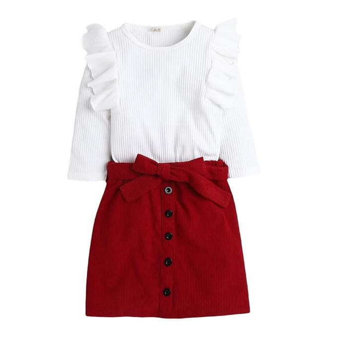 Girls Cotton and Spandex Solid Ruffled 3/4th Sleeves Top And Skirt Set in White Color