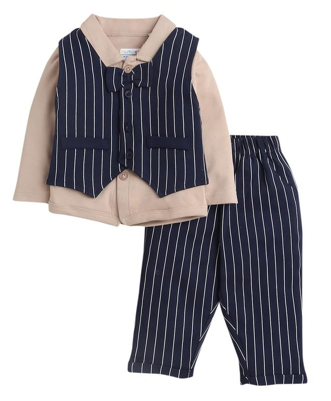Navy Boys Full Sleeves Shirt Waistcoat & Pant Set With Applique Bow